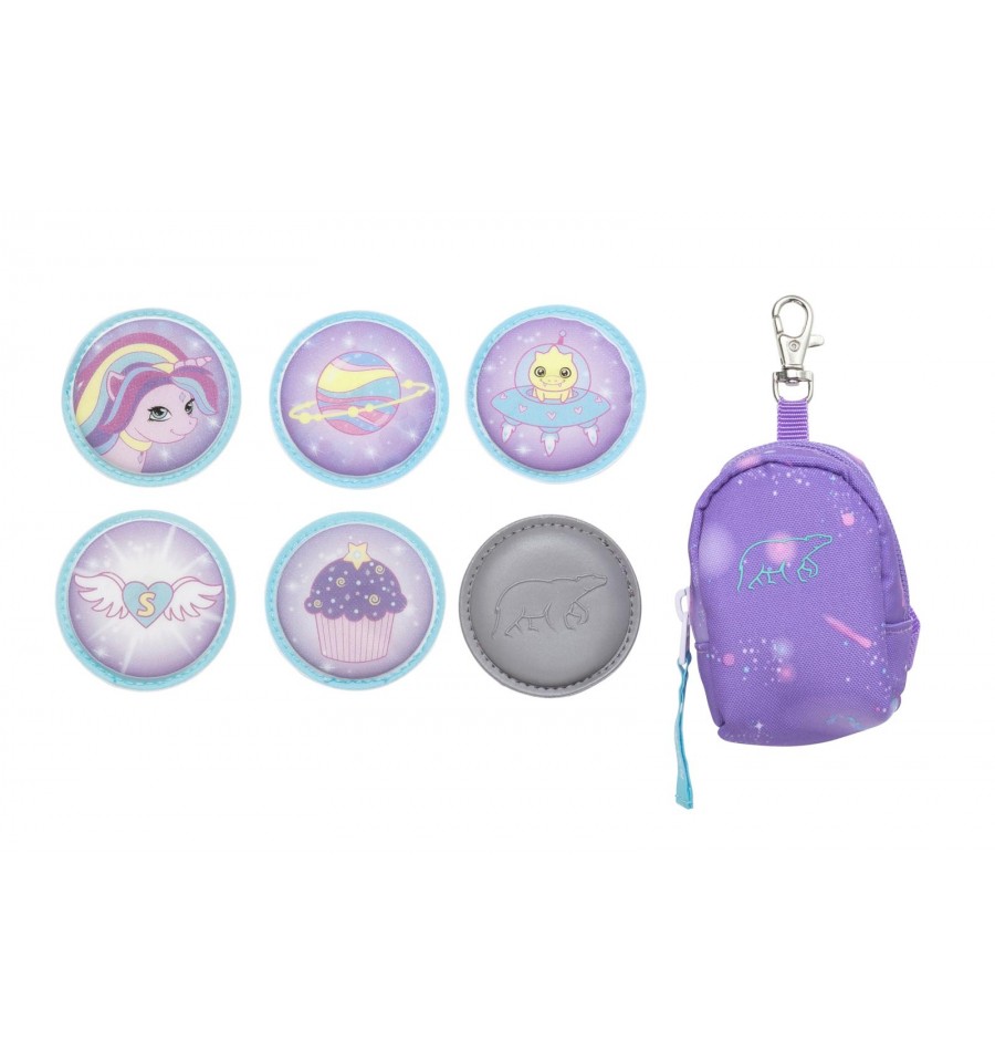 11. okrągłe dekoracyjne rzepy, które możemy wymieniać kiedy tylko mamy ochotę, umieszczone w mini plecaczku zawieszonym na breloczku