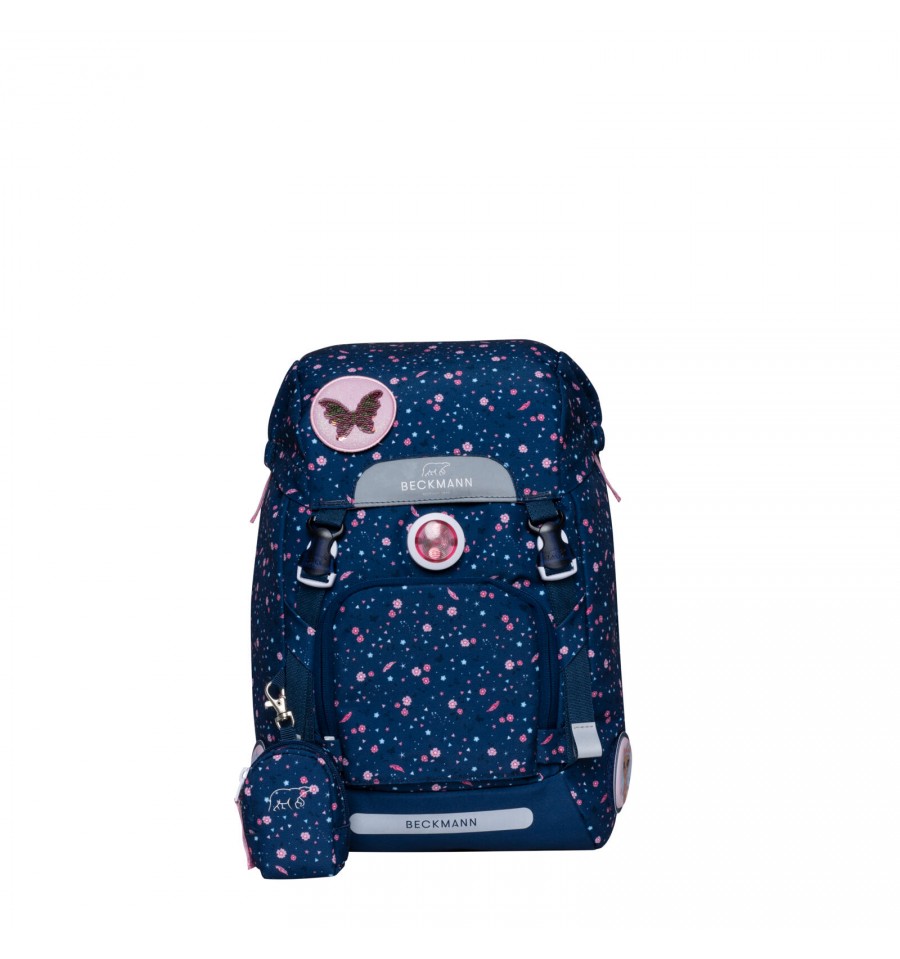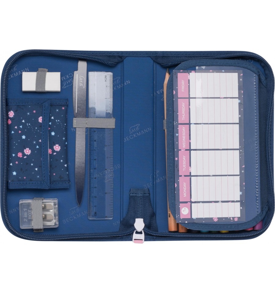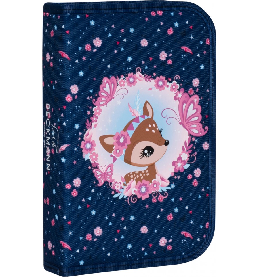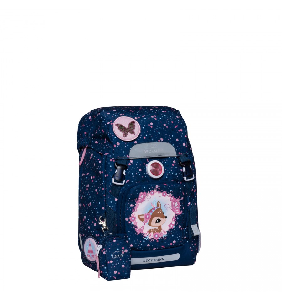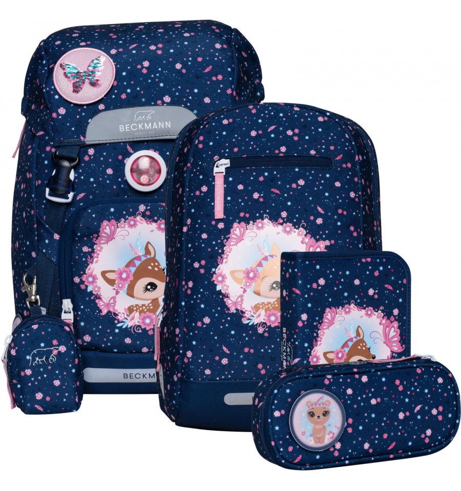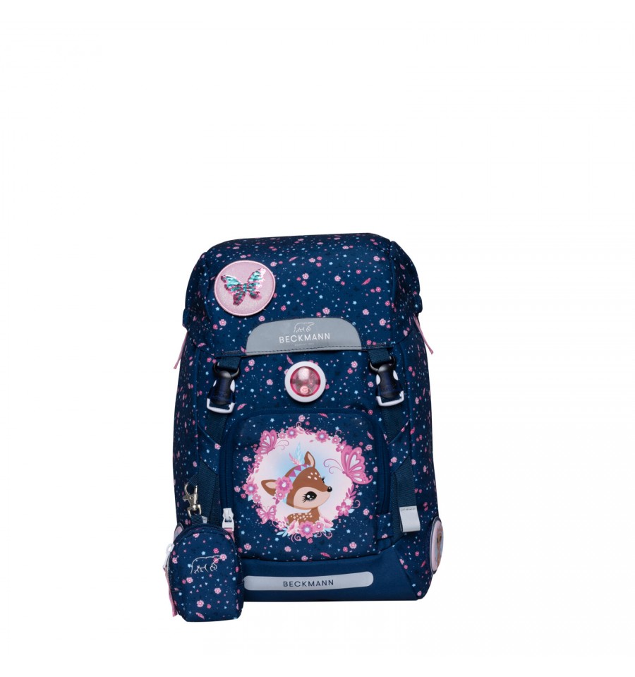 Piękny zestaw do pierwszej klasy Forest Deer Blue z małym jelonkiem na przedniej kieszeni utrzymany w pięknym granatowym odcieniu i kwiatowym princie.