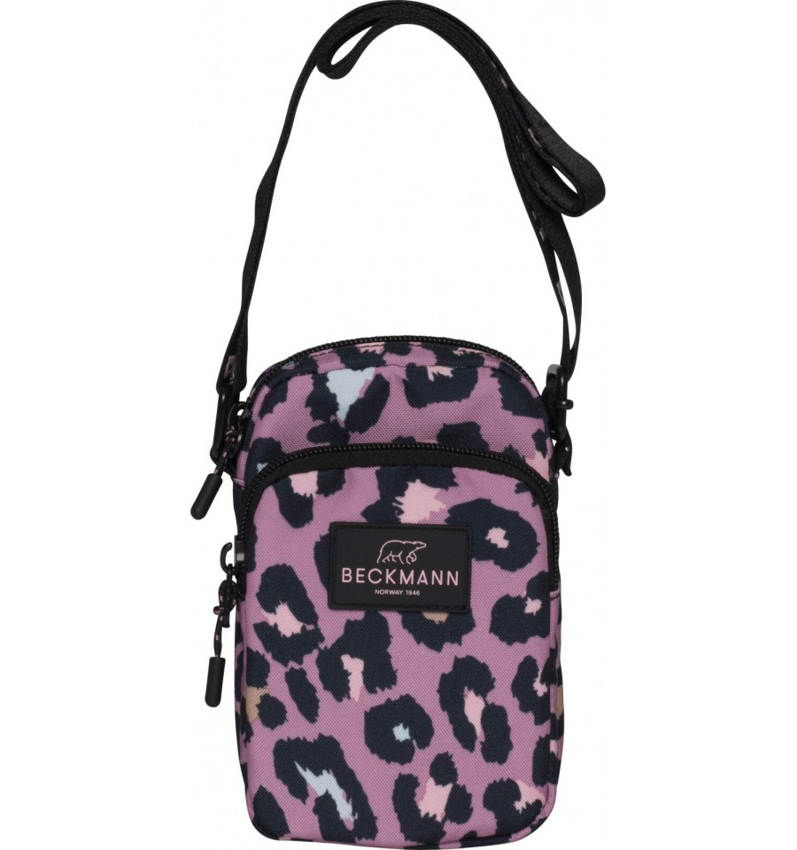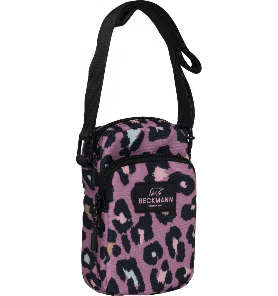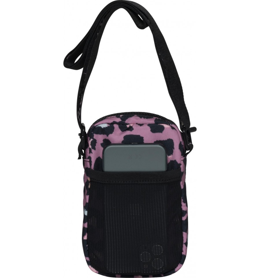 Praktyczna torba na ramię Dark Safari w piękną różowo-czarną panterkę  z dwiema kieszeniami zapinanymi na zamek i siateczkową kieszenią.