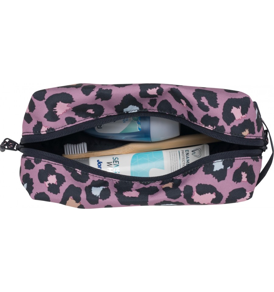 Kosmetyczka sportowa Dark Safari idealnie pasuje do torby sportowej Dark Safari i innych produktów z serii Dark Safari. Zapinana na zamek, z małą rączką do chwytania w piękną różowo-czarną panterkę. Wykonana z poliestru. Wymiary kosmetyczki: 24x11x12 cm.