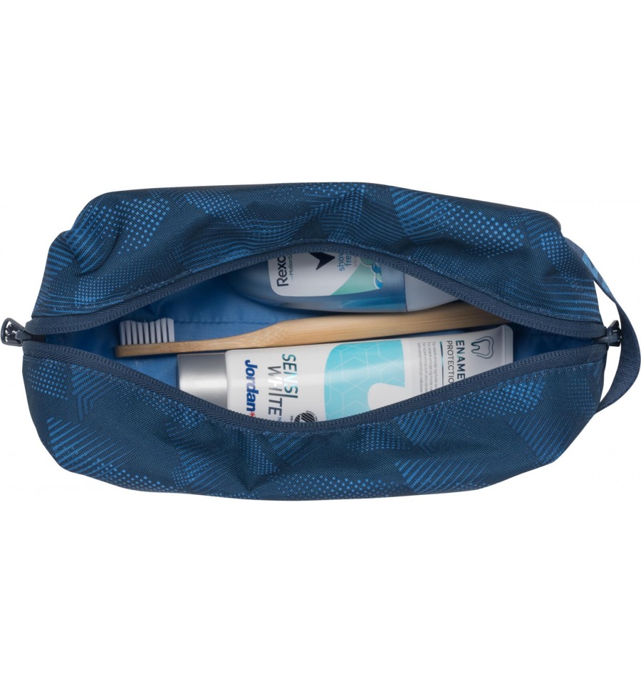 Kosmetyczka sportowa Blue Quartz idealnie pasuje do torby sportowej Blue Quartz i innych produktów z serii Blue Quartz. Zapinana na zamek z małą rączką do chwytania wpieknym granatowo-niebieskim princie. Wykonana z poliestru. Wymiary kosmetyczki: 24x11x12 cm.