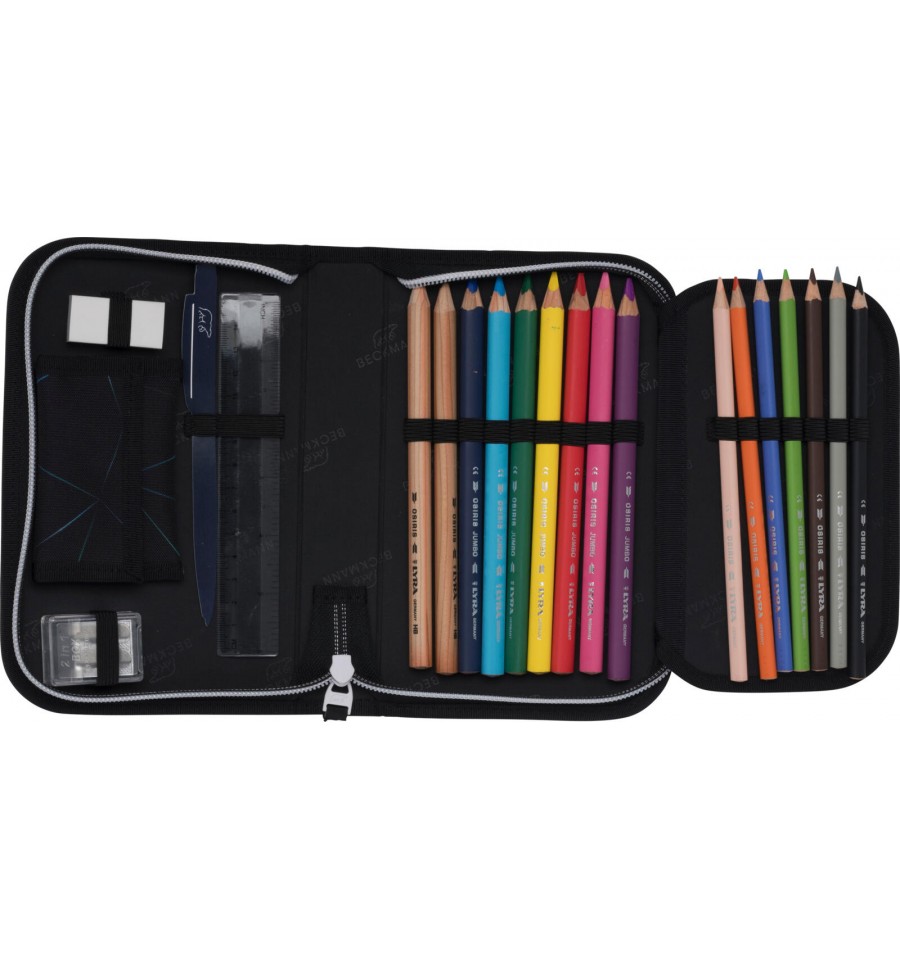 Jednokomorowy piórnik Night Rider doskonale komponuje się z plecakiem do pierwszej klasy Night Rider. Wewnątrz piórnika znajduje się 14 sztuk wysokiej jakości kredek oraz dwa ołówki. POnadto gumka, temperówka, inijka oraz plan lekcji. Dostępny jest także malutki, odpinany na rzep portfelik w takim samy wzorze jak piórnik.