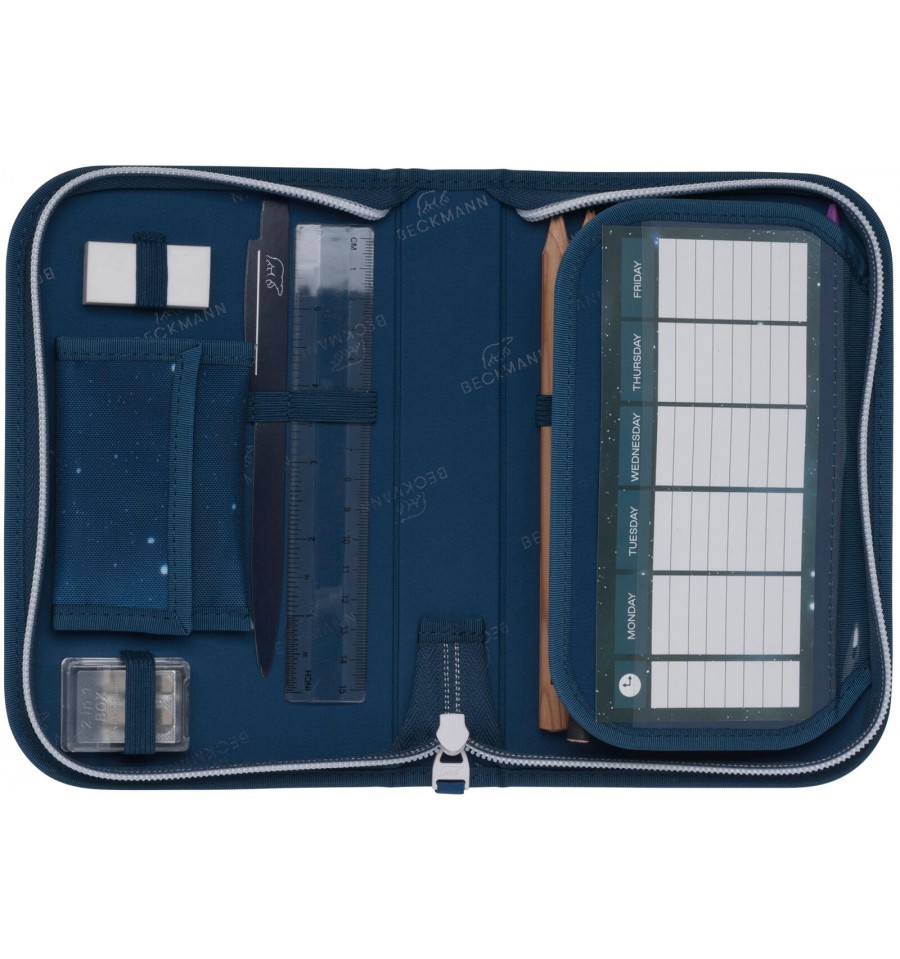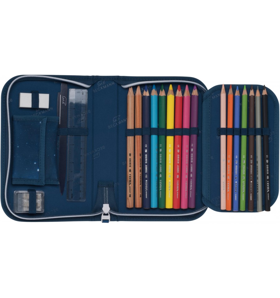 Jednokomorowy piornik Space Mission doskonale komponuje się z plecakiem do pierwszej klasy Space Mission. Wewnątrz piórnika znajduje się 14 sztuk wysokiej jakości kredek oraz dwa ołówki. Ponadto gumka, temperówka, linijka oraz plan lekcji. Dostępny jest także malutki, odpinany na rzep portfelik w takim samy wzorze jak piórnik.