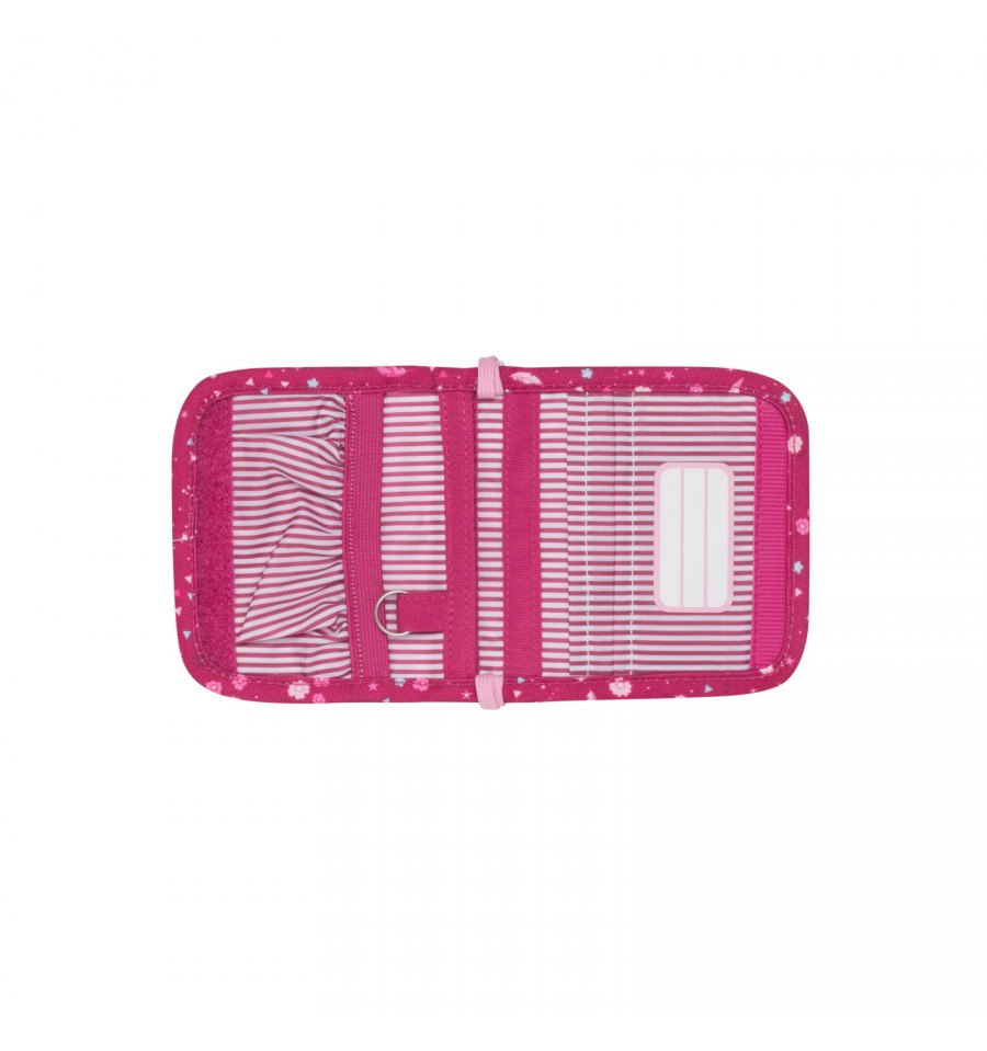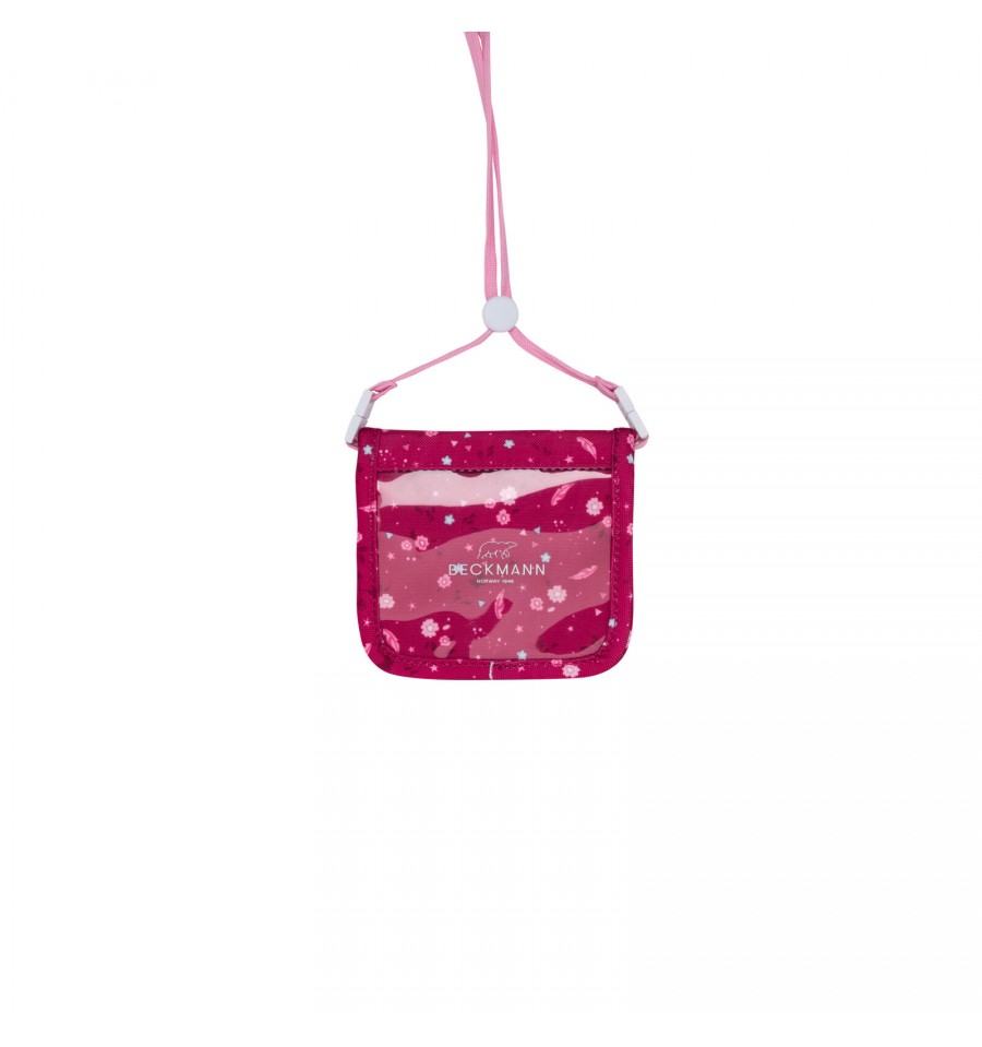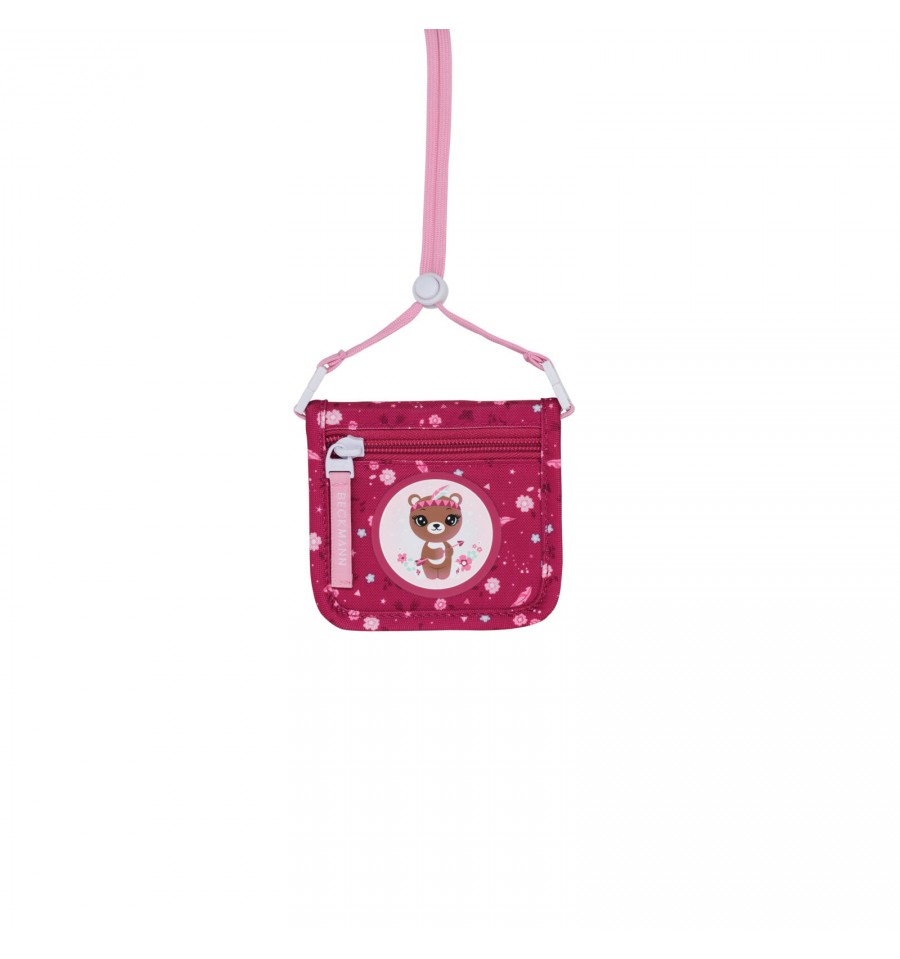 Praktyczny portfelik na drobiazgi na regulowanym sznurku, z miejscem na klucze; sprzodu mała kieszonka na zamek.