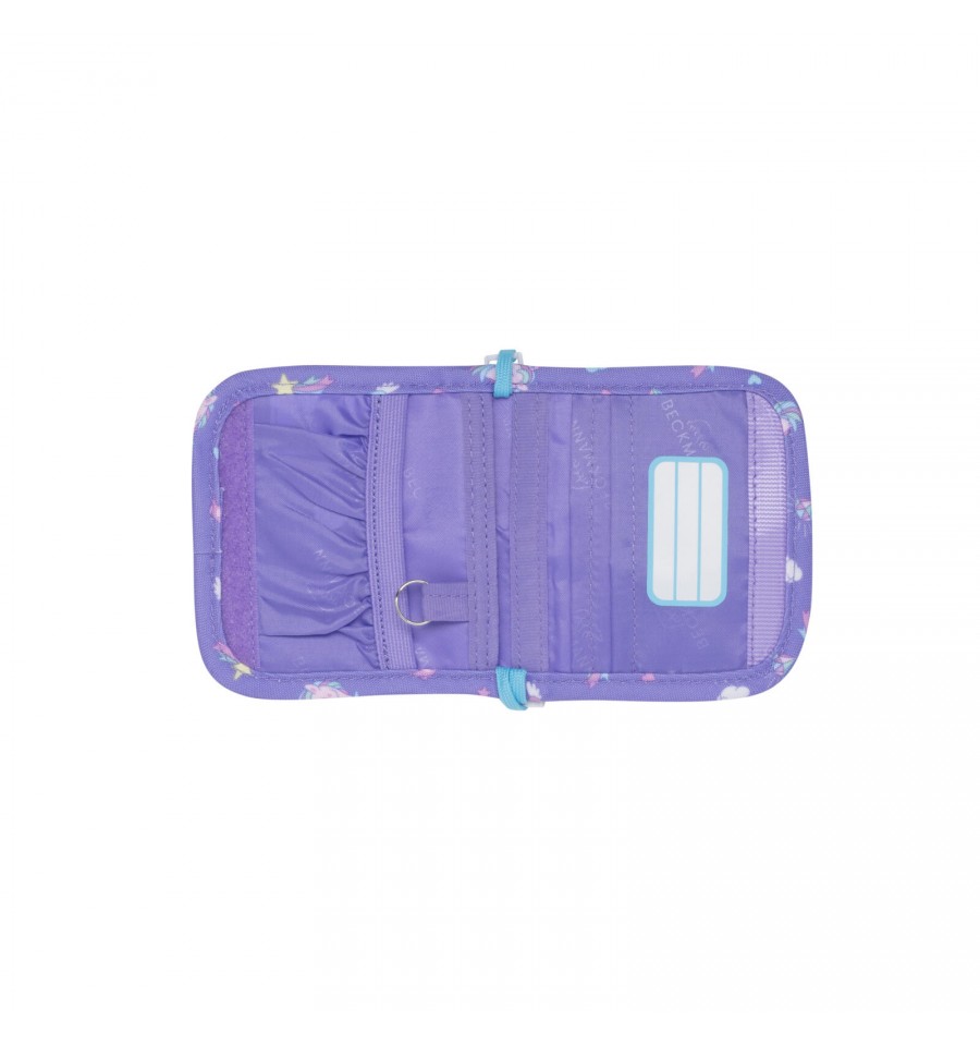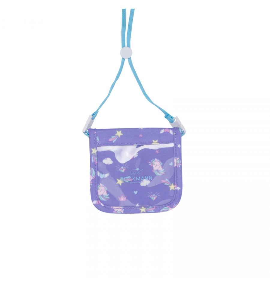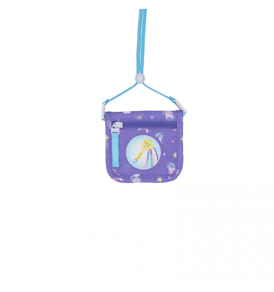 Praktyczny portfelik na drobiazgi na regulowanym sznurku, z miejscem na klucze; sprzodu mała kieszonka na zamek.